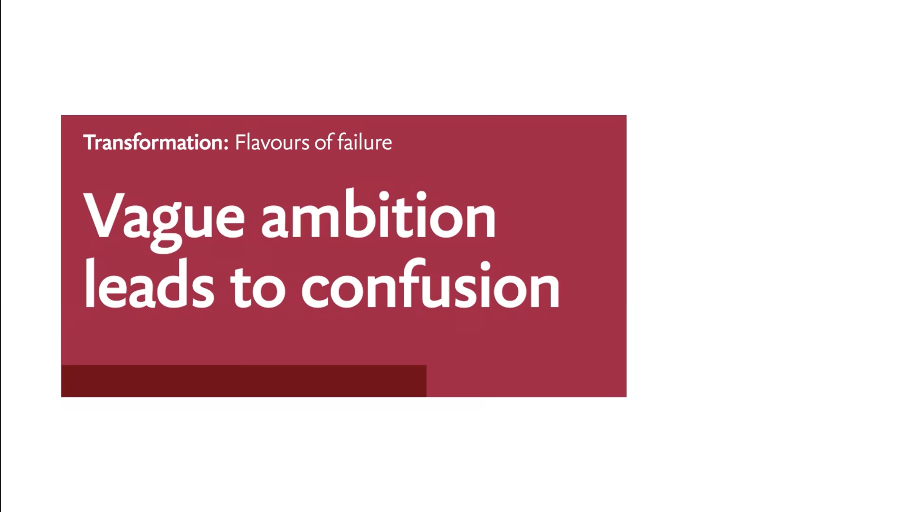 Tom: You want to set the transformation ambition from the outset, and communicate that in a clear and concise way. However, if you haven't done enough work on your ambition and objectives, people will be confused about what it is you're trying to change and why. You need a central vision that acts as a North Star to anchor your transformation and the team or else they won't understand what success is or when you've got there. This will lead to wasted effort, people pulling in the wrong direction or multiple initiatives that overlap.